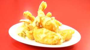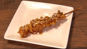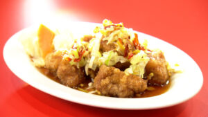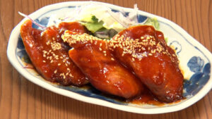 鶏皮を焼き上げて、甘酢のタレを絡めています。