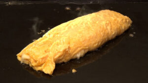 目の前の鉄板で焼いてくれる出汁まきも人気です。