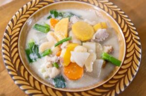 - 大根とにんじんはいちょう切り、さつまいもは輪切りか半月切りにして、水にさらします。椎茸、鶏肉、厚揚げは一口大に、青ネギは2cmに切ります。