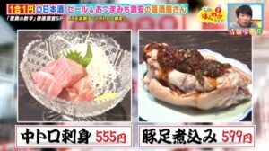 看板メニューの中トロ刺身(555円)・豚足煮込み(599円)と、リーズナブル!