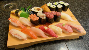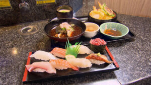 天ぷらに、あらのお味噌汁、お寿司はその日獲れた新鮮な魚介を使用しています。