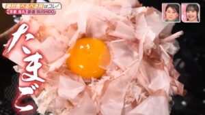 鰹節の上に卵をのせると、超贅沢な卵かけご飯に。