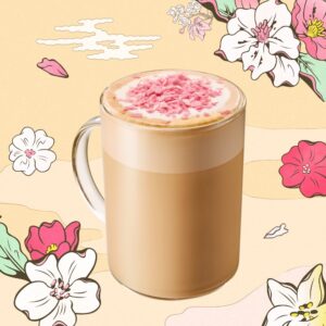 花見気分を味わえるように舞い散る桜をイメージしたさくらフィアンティーヌとスプリングブロッサミングフレーバーシロップをトッピングしました。