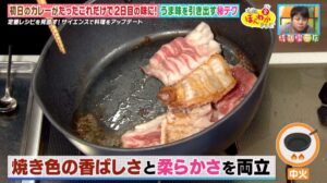 - 鍋にサラダ油をしき、豚バラ肉の片面に焼き色がつくまで中火で焼きます(約2分)。