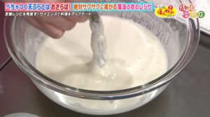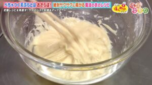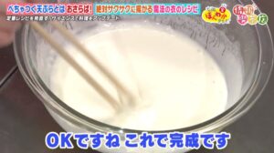 - 薄力粉を油でコーティングし、べちゃべちゃの原因であるグルテンの生成を防ぐ。