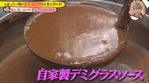 味の決め手の自家製デミグラスソースは、1週間牛すじを煮込んだスープをベースに、ケチャップ、ウスターソースなどで味を整えています。以上煮込んでいます。