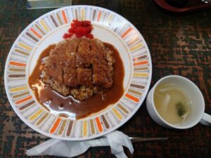 ご飯の上にカツをのせ、甘めのデミグラスソースをかけた、ボリューム満点メニュー。