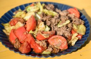 - 肉の色が変わってきたらキャベツを加え、さらにトマトを炒めます。