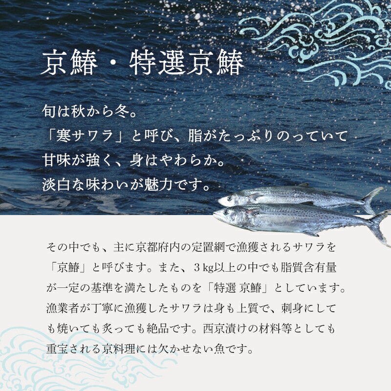 京都府内の定置網で漁獲される1.5kg以上のサワラを「京鰆」と呼び、3kgを超える物を「特選京鰆」と呼びます。