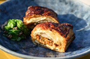 - ③をパイ生地で包み、卵黄を表面に塗り、30分ほど冷蔵庫で寝かします。