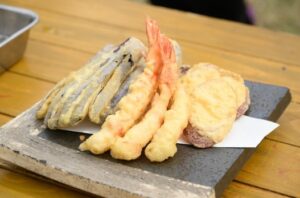 - 天ぷら粉を水で溶き、衣を付けてそれぞれ揚げます。(さつまいもは160℃、他は170~180℃)
