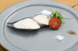 - フライパンに鰆となたね油を入れ、大葉としょうがを乗せます。