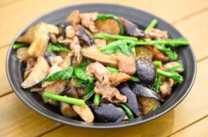 - ナスに焼き色が付いてきたらなたね油を足して豚肉を炒め、色が変わったら菜の花も加えます。