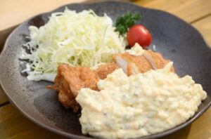- ②に溶き卵を付けて、160℃に予熱したなたね油でしっかりと揚げ、最後に油の温度を上げて表面をカリっと揚げます。