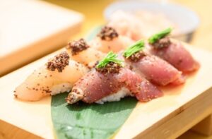 - 酢飯と握り、それぞれに和からしマスタードを乗せ、カツオにはさらに芽ネギを乗せて完成です!