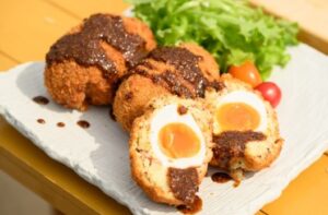 - ゆで卵をポテトサラダで包んで形を整え、薄力粉、溶き卵、パン粉を付けます。