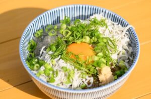 - 大葉は卵の周りに、青ネギは釜揚げしらすとしらす干しの上に、おろししょうがは生しらすと沖漬けの上にそれぞ