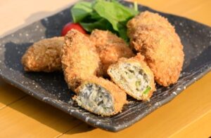 - 薄力粉、溶き卵、パン粉の順に衣を付け、170℃の油で揚げて完成!