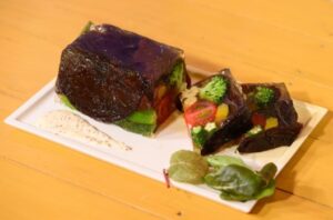 - テリーヌ型にラップを敷き(角までしっかりと張ります)、きくらげが熱いうちに型の内側に沿って詰め、他の野菜も彩りよく詰めます。(野菜が大きすぎる場合は切ります)