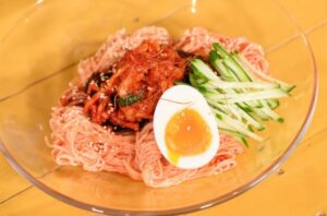 - そうめんをボウルに移し、ヤンニョム、麺つゆ、酢、ごま油をよく和えます。