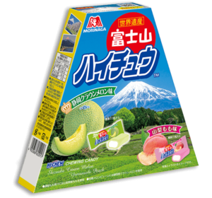 桃は山梨産、メロンは静岡県産クラウンメロンの果汁を使用した富士山の形をイメージした限定ハイチュウ。
