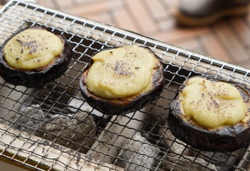 - ③の揚げたなすを炭火(もしくはフライパン)で焼き、上に⑤の味噌を塗る。