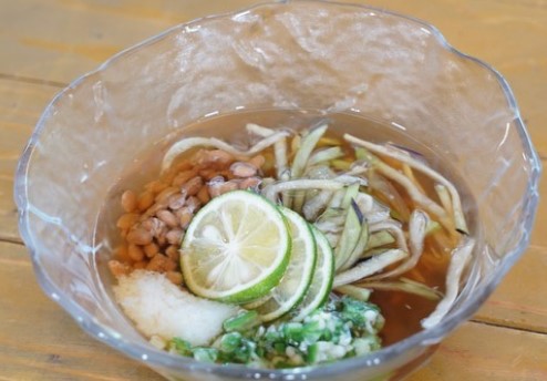 - 茹でたなすの水分を切って器に盛り、しょうゆ出汁を注ぐ。オクラ・すりおろした長芋・納豆(2パック)すだちをのせたら完成!