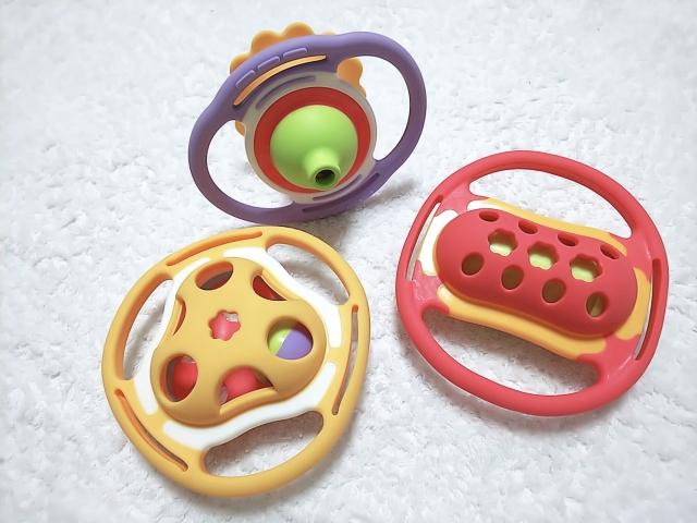 赤ちゃんは視力が弱いので、パステルのような優しい色の歯固めより、カラフルな歯固めのほうが、手に持ちやすいです。