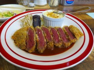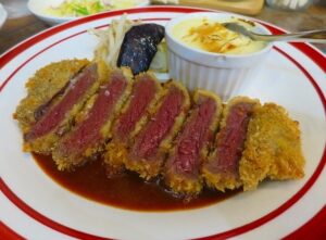特別に業者から仕入れているサーロイン牛は、中に火が入りすぎないようサッと揚げ、外はサクサク