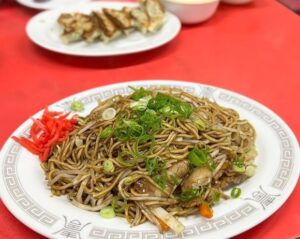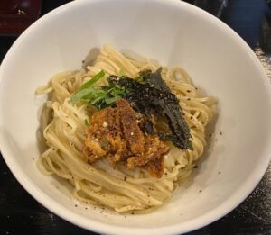 珍油としょう油ダレで和えた麺に、ねぎ、細切れチャーシュー、のり、ごま、ブラックペッパーをのせた油そばのようなもの。
