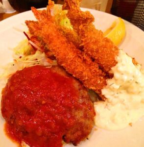 • 自家製タルタルソースがたっぷりかかった、ボリューム満点の天然エビフライ(1.400円)