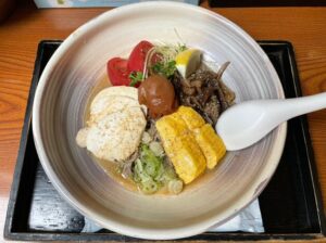 優しいお出汁とお肉のコク、スパイスの絡みがたまらない一品です。