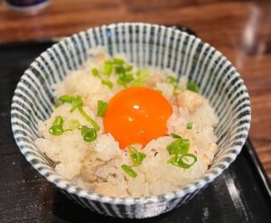さらにガッツリ食べたい方は、鶏だしがきいた炊き込みご飯に卵黄をのせた、月見鶏めし 日替わり高級赤卵使用(350円)がおすすめ