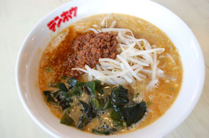 スープはブラウンカラーで、トッピングは肉みそとわかめともやしと一般的なタンタンメンと違います。