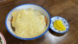 どんぶりご飯の上に、カラッと揚げたカツを斜めにカットして、アワアワ卵をたっぷりかけて完成です。
