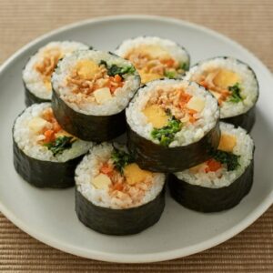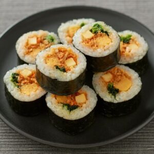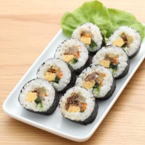 韓国語では「キム=海苔」「パブ=ごはん」を意味しており、酢飯ではないごはんと多種類の具材を用いて、ごま油で味付けするのが特徴です。