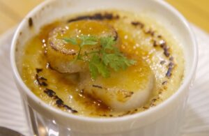 - 蒸しあがったココットに④を乗せ、表面にグラニュー糖を広げ、バーナーで焼き色を付けるます。