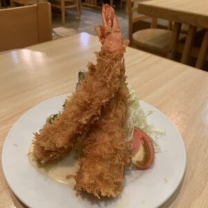 今回は標準サイズのとんかつを注文したが、それで大人が満腹になるには充分な量。圧巻はエビフライ!!