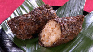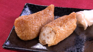 揚げの代わりに、甘辛く炊いたこんにゃくで包んでいます。