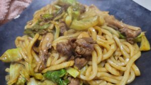 味噌たっぷりの焼肉とうどんを組み合わせたみそ焼きうどん。