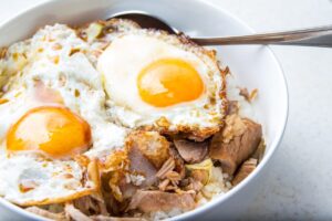 焼豚玉子飯は、ご飯の上に、チャーシューと焼いた目玉焼きが乗っています