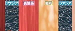 人の顔をめくっていくと、脂肪、その下に表情筋があり、それをファシアで包んでいます。