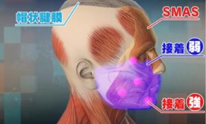 ヒトの顔の中には、脂肪や表情筋をファシアで包んだ袋、SMASがあり、頭頂部にある帽状腱膜や皮膚との接着で支えています。