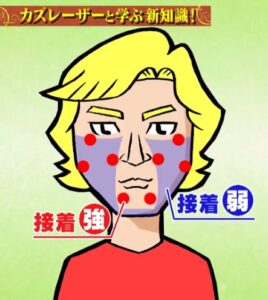 目の下・頬周り・エラ回り・顎下で接着が強い。