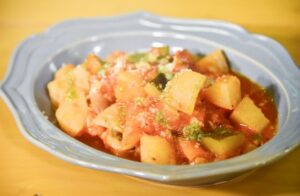 1. ズッキーニはそれぞれ乱切りにします。じゃがいもは皮を剥いて乱切りにし、レンジにかけておきます。にんにくは、みじん切り、ベーコンは一口大に切ります。